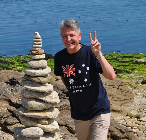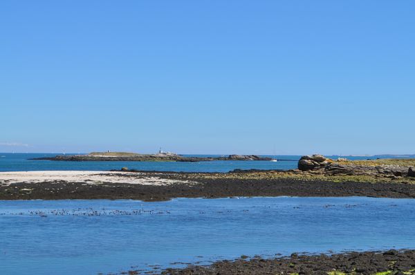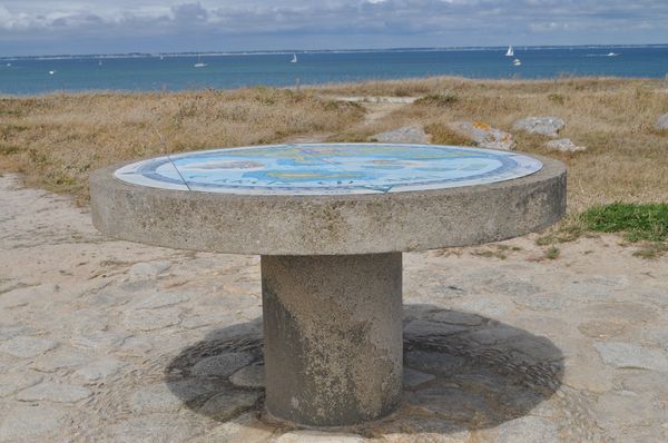 Nous décidons de marcher jusqu'à la Pointe du Conguel (ci-dessous) située à l'extrémité sud-est de la presqu'île. Un conguel est un groupe proche du style de Groh-Collé. Une poterie dont la paroi supérieure verticale est ornée d'un bandeau de groupes de lignes tracées à l'aide d'une baguette. Cette pointe est elle-même une presqu'île d'environ un kilomètre de long sur 200 mètres de large, placée sous la protection du Conservatoire du littoral. On y accède par un sentier littoral. A l'origine, l'endroit était une île formée par des roches reliées entre elles par du sable accumulé, île désormais rattachée au continent par un tombolo de trois cents mètres de long. Deux îlots prolongent cette pointe: L'îlot Toul Bihan, accessible à pied lors des grandes marées, et Toul Bras où l'on découvrit des sépultures gauloises. Les Gaulois de la tribu des Vénètes régnèrent en effet sur ce territoire appelé Morbihan. Pour l'heure, ce sont d'étranges sculptures de pierres empilées les unes sur les autres qui attirent mon attention (deuxième photo). Une table d'orientation (troisième photo) permet de situer les différents points de vue qui s'offrent à nous par cette belle journée ensoleillée.