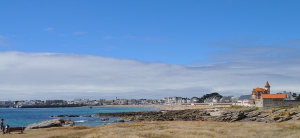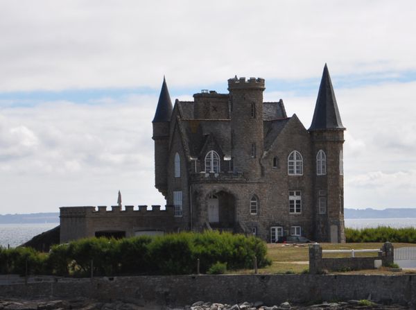 Nous longeons en voiture le Casino de Quiberon (à droite de la photo ci-dessous) qui fut bâti en février 1893. En 1924, la ville est classée en tant que station climatique. Et héberge depuis des termes marins: En 1964, le docteur Raymond Denniel y crée un centre de Thalassothérapie dont le premier directeur de cet institut sera le célèbre cycliste français Louison Bobet. Quelques minutes plus tard, nous passons devant le port de la criée, Port-Maria, puis nous dirigeons vers le Château Turpault (deuxième photo): Située sur la pointe de Beg er Lann, cette demeure marque l'entrée sur la Côte sauvage. Ce manoir de style anglo-médiéval fut construit en 1904 par Georges Turpault, filateur de Cholet , qui le baptisa le château de la mer. Les Quiberonais le rebaptisèrent plus tard « Château Turpault », du nom de son ancien propriétaire. L'endroit ne peut pas être visité car il est désormais une propriété privée.
