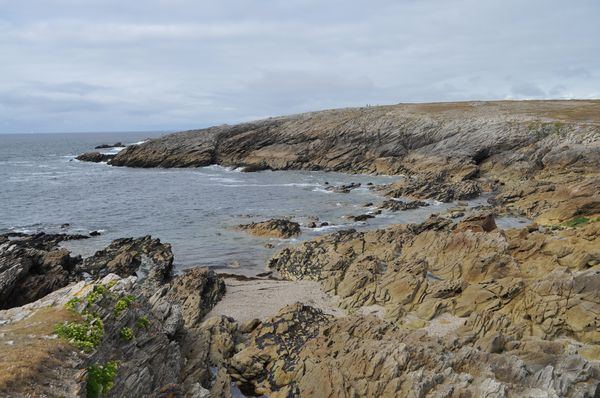 Notre promenade se termine par la côte sauvage qui s'étend sur huit kilomètres, depuis le château Turpault jusqu'à la pointe du Percho. Propriété du Conservatoire du littoral, cette côte sauvage (troisième photo) est sans cesse harcelée par la mer et les vents: Les vagues viennent se fracasser sur les falaises escarpées, provoquant des jaillissements d'écume. L'érosion y a façonné d'innombrables criques , récifs, grottes et arches que l'on ne découvre qu'à marée basse. Ses falaises sont recouvertes d'un tapis d'herbe rase où fleurissent de petites fleurs roses, œillets et arménies maritimes. La route côtière est jalonnée de nombreuses aires de stationnement et permet d'accéder au sentier côtier. En prenant le temps nécessaire, on peut ainsi découvrir successivement l'ancien vivier, le trou du souffleur, la fontaine de Port Kerné , la pointe de Kervihan, Port Bara et sa grotte visible à marée basse, la plage de Port-Blanc et son arche, la pointe du Percho dominée par les vestiges d'un ancien poste douanier. Enfin, la pointe de Beg en Aud et son camp vénète.