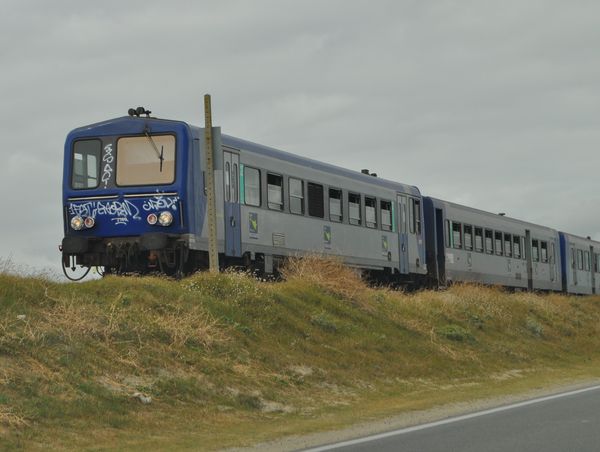 En guise de promenade digestive, Lionel me propose de faire le tour de la presqu'île de Quiberon. Située à 28 kilomètres d'Auray, Quiberon est desservie par une route relativement encombrée en saison estivale. Il est aussi possible de s'y rendre en train (ci-dessous) depuis la gare d'Auray, mais en été seulement. Cette ligne, inaugurée en 1882, fait malheureusement terminus à Auray, alors qu'une desserte jusqu'à Vannes aurait été sans doute plus bénéfique. Autrefois, le train permettait de transporter des munitions vers les batteries de la côte, ainsi que quelques touristes qui découvraient les bienfaits de la mer. Le train sera surnommé « le Train des Cocus » car il transportait alors les hommes qui venaient le week end rejoindre leurs femmes qui étaient en vacances sans leurs maris alors trop occupés par leurs affaires...Le TER, mis en place dans les années 1980 sera, lui, appelé « Tire-bouchon » car il contribuera à désengorger la circulation routière de la presqu'île. ..Pas moins de dix plages sont ainsi offertes aux nombreux touristes qui y débarquent chaque année. Parmi elles, la Plage du Fort-neuf, ou encore la Plage du Conguel (deuxième photo ci-dessous). Dans le prolongement de la Pointe du Conguel et de l'île d'Houat, on peut aussi apercevoir le Phare de la Teignouse, que ses anciens gardiens ont quitté en 1983. Ce phare marque la limite de la baie de Quiberon en direction de Belle-île en mer, toute proche.