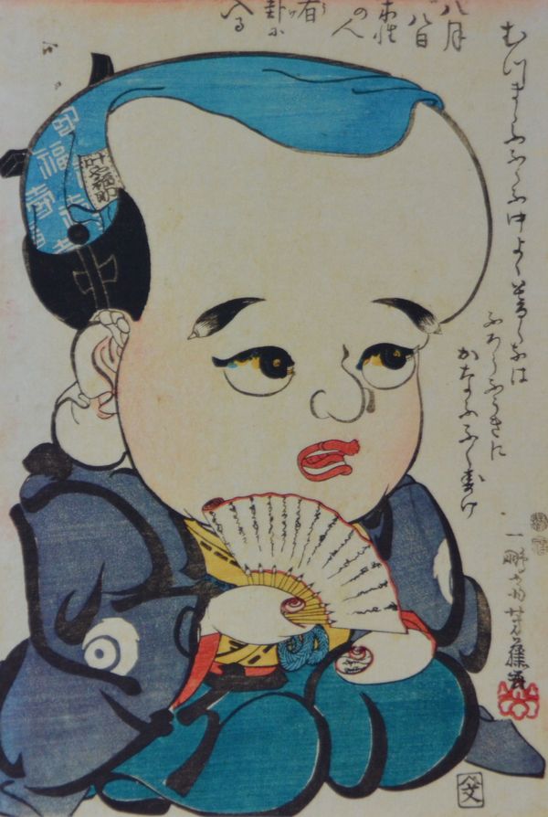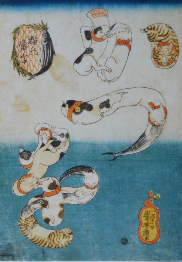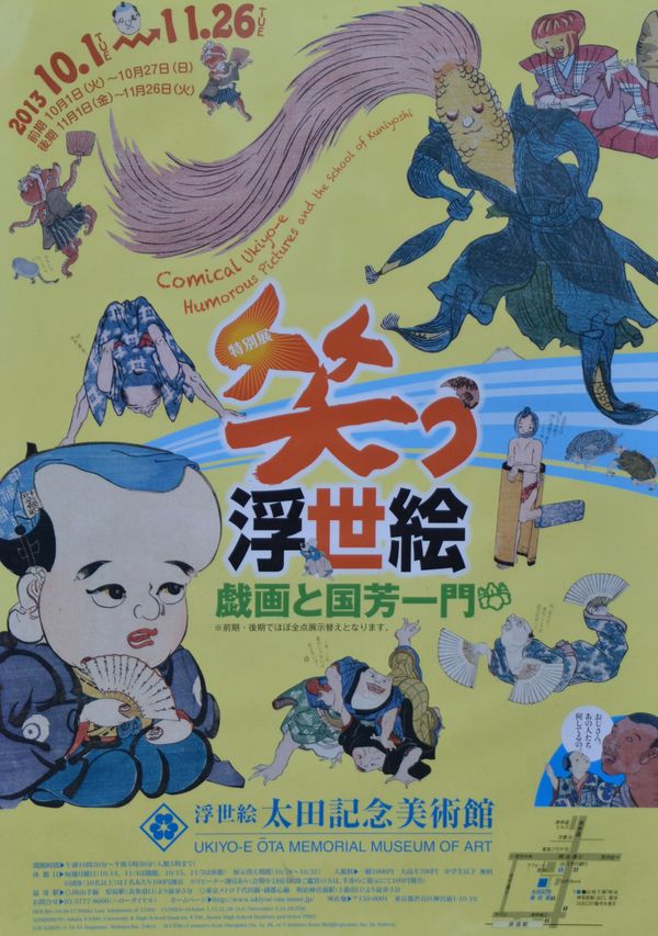 Actuellement, et durant tout le mois de novembre, le musée présente une exposition sur les ukiyo-e comiques : du temps d'Edo, on s'aimait rire et s'amuser. On assista ainsi à l'apparition de pièces de théâtre kabuki, à une nouvelle littérature, et au rakugo (une façon traditionnelle de raconter des histoires drôles). L'ukiyo-e créa aussi de nouvelles estampes à l'humour raffiné, notamment à la fin de la période Edo, grâce à Utagawa Kuniyoshi, grand maitre de l'ukiyo-e. Né le 1er janvier 1797, il était le fils de Yanagiya Kichiyemon, artisan dans la soie. Il aurait,dit-on, été impressionné à l'âge de sept ans par une estampe représentant un guerrier, puis aurait montré des dispositions pour le dessin cinq ans plus tard. D'abord apprenti dans un atelier jusqu'en 1814, il prend son envol sous son nom d'artiste, Kuniyoshi. Malgré des débuts difficiles, il s'illustre bientôt dans la reproduction de soldats dans un style bien à lui. Les réformes Tenpo (de 1841 à 1843) tendant à contrôler l'affichage public, contraignit notre artiste à dissimuler ses personnages ( dont les courtisanes et les acteurs dont la reproduction étaient interdites à cette époque) par des représentations caricaturales appelées « giga ». Ces dessins comiques se livraient à une critique du shogunat mais devinrent extrêmement populaires auprès du public. En réalité, la censure imposée par le gouvernement d'alors permit à l'ukiyo-e de se lancer dans un défi artistique où l'ingéniosité créatrice était reine. Dans les années qui suivirent la réforme, Kuniyoshi dessina des paysages, mais aussi des animaux, des oiseaux et des poissons en imitant les peintures traditionnelles japonaise et chinoise. A la fin des années 1840, il utilisa l'écriture enfantine pour tracer des kana sous les visages des acteurs qu'il reproduisait. Amoureux des félins, il se mit à tracer les hommes en forme de chats dans des gravures satiriques, grossissant de manière exagérée les traits du visage de ses personnages. A partir de 1856, Kuniyoshi souffrira de paralysie mais assistera cinq ans plus tard (juste avant son décès) à l'ouverture de Yokohama aux étrangers. Deux de ses œuvres représentent d'ailleurs les Occidentaux dans cette ville.