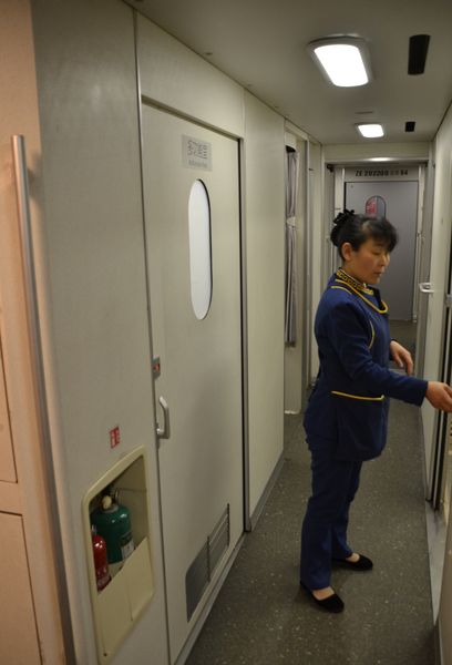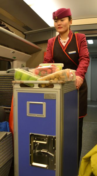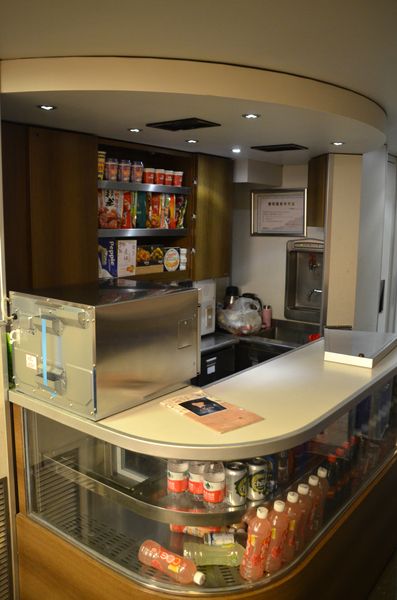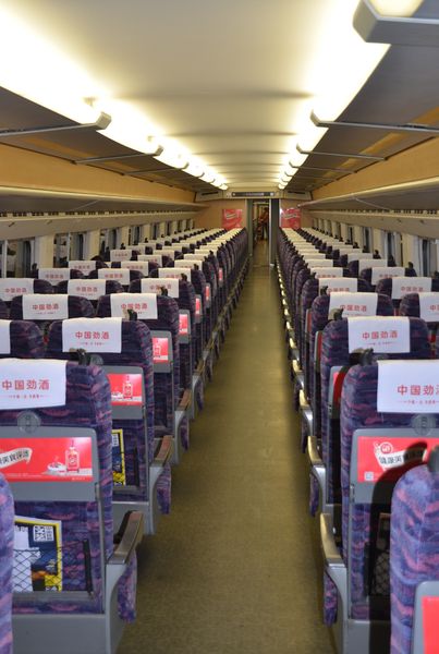 En montant à bord de notre train, je découvre avec surprise que la voiture première classe est en tout point similaire à une voiture première classe d'un...shinkansen (Japon) ! Les sièges sont identiques, les aménagements aussi. J'en conclus que la Chine a du acheter des rames auprès des Japonais en attendant de produire les leurs. Un petit tour dans la rame s'impose. Je me rends à l'extrémité de la voiture et découvre le même espace, les mêmes toilettes. Une fontaine d'eau en libre-service remplace juste les distributeurs de boissons que l'on trouve au Japon. Il est aussi possible de disposer d'eau chaude gratuitement. Une autre voiture accueille la seconde classe. Les sièges sont plus étroits. Un peu plus loin, dans la rame, je découvre la voiture-restaurant, et son coin bar, où s'est réfugié pour l'instant le personnel de bord qui consomme un encas. J'aperçois également d'autres personnels qui ont investi les sièges d'un wagon de seconde classe pour prendre quelque repos. Notre train ne comporte qu'une rame (huit wagons) et pas de classe affaires. Tout comme au Japon, le personnel de cabine est nombreux : on rencontre le contrôleur, les hôtesses de bord (dans leur uniforme rouge) et des femmes de ménage. Je commande un café au bar et le paye 10 yuans. Il s'agit d'un gobelet en carton pré-conditionné dans lequel l'hôtesse rajoute de l'eau chaude. Je me force à le boire car il est imbuvable ! En cabine, une hôtesse propose aussi des ventes à la place. La partie supérieure de son trolley est garnie de généreuses barquettes de fruits.Côté siège, je retrouve le même espace de confort pour les jambes qu'au Japon mais il existe des carrés Première classe (sur le modèle français, lequel, soit dit en passant n'est pas un modèle de confort!) pour quatre ou six passagers, mais l'espace pour les jambes est alors inexistant. Chaque pochette de siège comporte une revue de voyage, tout comme dans les trains japonais. Un bandeau lumineux, situé à l'extrémité de la voiture, annonce les prochaines gares et...la vitesse de croisière. Notre voyage est ponctué d'annonces effectuées par le personnel de bord. On nous y rappelle qu'il est formellement interdit de fumer et que le non-respect de cette règle pourrait occasionner l'arrêt du train. J'imagine déjà les conséquences...Nous arrivons à Yichang et quittons notre confortable siège pour poursuivre notre périple. La gare de Yichang est moderne (tout comme celle de Wuhan), propre, sans SDF ni mendiants.