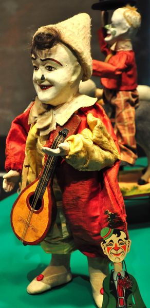 Les curieux dont je fais partie découvriront deux cirques rares : Celui de la firme américaine Schoenhut (1905) et l'incontournable cirque Pinder (1975). Fondé en 1854 au Royaume-Uni, le cirque Pinder doit son existence aux Frères Williams et à George Pinder. Au tout début, ce cirque fut surnommé « cirque Britania », du nom du navire dont les voiles servent désormais de chapiteau. Puis, Pinder se donna une mascotte : l'éléphant. Après de nombreux allers et retours entre l'Angleterre et notre pays, le cirque s'installera en France dès 1904, pour débuter depuis ses tournées chaque année à Tours et les finir à Paris aux alentours de la mi-janvier. George et William Pinder étaient à l'origine des spécialistes de l'âge équestre. Le cirque Pinder deviendra le partenaire de l'ORTF, dans les années soixante, période durant laquelle il accueillera Roger Lanzac pour l'émission de radio « Le Jeu des Mille francs », puis l'émission « La Piste aux Etoiles ». En difficulté à partir de 1971, il est racheté par Jean Richard et porte le nom « Pinder-Jean Richard ». En 1983, Gilbert Edelstein (le père de Frédérick, qui est maintenant l'actuel directeur du cirque) , collaborateur de Jean Richard, rachète les actifs de l'entreprise. Ce cirque Pinder est une œuvre à quatre mains. Dès les années 1970, Pierre Petit imagine et fabrique des jouets en bois dans son appartement de Bourges. Raymonde Petit, son épouse, les peint avec une palette de quatre couleurs, des Valentines vives (jaune, rouge, bleu et verte). Ce cirque est composé d'une grande caravane sur roulettes, avec vingt-sept éléments, prête à prendre une route imaginaire. Il invite au voyage magique, tout en célébrant la fête, la loisir mais aussi un rite de passage avec le portique Pinder. Un troisième cirque (celui des Champs-Elysées), aujourd'hui disparu, témoigne d'une salle mythique et est aussi visible dans cette exposition. Celui-ci s'appela d'abord Cirque d'été, puis Cirque-Olympique des Champs Elysées, Cirque-National, puis Cirque de l'impératrice. D'abord simple cirque de planches et de toile installé par Adolphe Franconi (petit-fils du créateur du Cirque Olympique en 1835) la construction est remplacée en 1841 par un vaste édifice en meulière de 6000 places construit au Carré Marigny, d'après les plans de Jacques Hittorff, puis décoré par Bosio, Duret et Pradier. Copie en quelque sorte du Cirque d'Hiver, celui-ci fonctionnait du 1er mai au 1er septembre, en mettant à profit son exceptionnelle acoustique (Hector Berlioz y donnera une série de concerts en 1845) et sa célèbre attraction d'alors, le clown sauteur Jean-Baptiste Auriol. Son succès se poursuivra jusque dans les années 1880. Il sera démoli vers 1900, laissant son nom à la rue du Cirque. Le jouet animé et musical remonte à la fin du XIX è siècle et est constitué d'un coffret rouge et de ses deux battants. Une fois ouverts, ceux-ci sont décorés de loges occupées par des spectateurs en tenue de soirée. Cette boite à musique, conçue pour fasciner et endormir les enfants témoigne des loisirs et du public de l'époque.