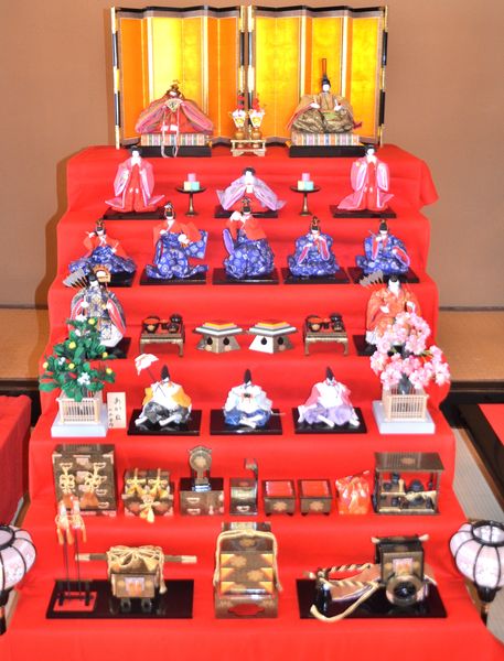 On parle de « Fête des poupées » lorsqu'on évoque Hina Matsuri car l 'élément le plus significatif de cette événement est la décoration mise au point pour l'occasion, avec ces fameuses poupées hina : chaque famille va installer le tokonoma (représentation d'une cour impériale de l'ère Heian) dans une alcôve de la pièce principale de la maison. La disposition des poupées obéit à des règles puisque les reproductions de scènes les plus élaborées (donc, les plus couteuses!) comportent jusqu'à sept étages (ci-dessous), d'une plateforme appelée hina dan, qu'on recouvre d'un tissu rouge (dankake) qui servira de décor. Cependant, si on manque de moyens, ou de place, l'alcôve sera plus modeste et moins décorée, n'accueillant que quelques poupées en origami, voire même une seule statuette en guise d'ornement.
