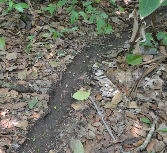 Les fourmis s'affairent quant à elles au transport des végétaux et créent de véritables « autoroutes » qui traversent le chemin que nous parcourons (ci-dessous). Ces insectes sociaux forment des colonies appelées fourmilières.Nous en croiserons d'ailleurs une. Ces habitations, parfois complexes, rassemblent de quelques dizaines à...plusieurs millions d'individus. La société des fourmis possède une division de travail (selon l'âge et la caste) mais aussi une communication entre individus et une capacité à résoudre les problèmes difficiles. On en répertoriait en 2013 plus de 12000 espèces.