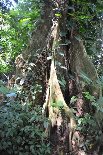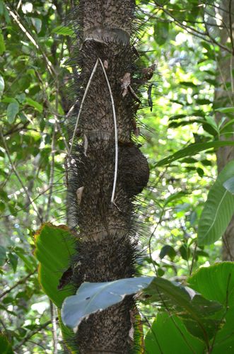 Nous poursuivons notre balade en forêt, tout en marchant parfois dans la boue ce qui attire les moustiques en rafales. Je me suis habillé comme pour affronter les sommets montagneux mais au moins, les bestioles ne me piquent qu'au visage et dans le cou. Nous apercevons différents arbres : certains sonnent creux quand on tape dessus (première photo ci-dessous), d'autres ont le tronc recouvert d'épines, comme pour se protéger des prédateurs (deuxième photo). Incroyable.