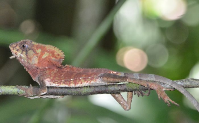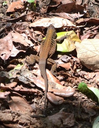 L'une des premières bestioles que nous remarquons est un serpent de vigne (première photo ci-dessus). Cette espèce se cache dans la végétation et chemine sur les branches des arbres et arbustes, d'où la première règle en matière de serpents ici : Ne jamais s'appuyer sur un arbre ou passer sa main dans les feuilles car cela peut comporter de mauvaises surprises. Le Costa Rica possède une flore et une faune exceptionnelles puis qu'ici se trouve 6% de la biodiversité mondiale, et 1,3% de la faune est endémique du pays. En 2007, l'Instituto Nacional de Biodiversidad considérait que 160 nouvelles espèces étaient découvertes tous les ans au Costa Rica. Plus de 25% du territoire est en effet occupé par des parcs nationaux et des réserves. Le tourisme, mais aussi la stabilité politique du pays contribuent à préserver cette biodiversité. On compte dans ce pays près de 220 espèces de reptiles, depuis la tortue de mer (qui est l'un des symbole du Costa Rica), mais aussi les lézards (ci-dessous) de toutes sortes, les geckos, les iguanes (deuxième photo) et les caïmans. Sur les 130 espèces de serpents, 17 sont dangereusement venimeux, dont le fer de lance et le serpent corail entre autre.
