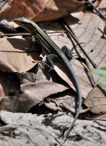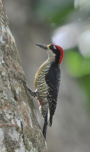 Notre marche s'effectue dans un sentier aménagé. Nous y rencontrons plusieurs touristes espagnols. Soudain, un pic vert (ci-dessous) sort de sa cachette et nous gratifie de sa présence. Il est ainsi surnommé car il a pour habitude de piquer l'arbre sur lequel il se trouve à l'aide de son bec. Le terme se réfère à un grand nombre d'espèces d'oiseaux. Un peu plus loin, un agouti traverse le sentier et reste là, en train de grignoter sous nos yeux. Dans la famille des grignoteurs, nous apercevrons également plusieurs écureuils qui n'ont pas leur pareille pour casser la coque des amandes ou d'autres fruits. Au fil de la matinée, la température monte et de nombreux petits lézards sortent prendre le soleil (deuxième photo).