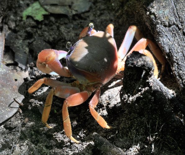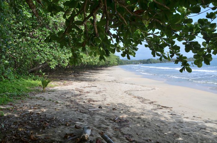 Non loin de Puerto Viejo, se dresse un petit village côtier appelé Cahuita. Situé dans le canton de Talamanca, Cahuita est tout de même la capitale du district et est riche de l'importante influence de la culture afro-caribéenne que l'on retrouve dans la cuisine mais aussi dans la culture. Ses plages sont superbes et il est ici de coutume de déguster la crêpe fourrée (de chocolat, banane et fraises), une spécialité du village, en guise de goûter. Le poulet grillé connait aussi un réel succès. A deux pas du village se trouve le Parc national de Cahuita, créé en 1970 sur les terres d'une ancienne ferme qui cultivait le cacao et la noix de coco. 1067 hectares sont ainsi désormais consacrés à la protection de la nature sur terre et 600 hectares en mer sont dédiés à la sauvegarde des récifs coralliens. La surface maritime du parc totalise 22400 hectares. C'est dire l'importance de ce patrimoine vivant sous-marin que de nombreux plongeurs viennent observer. Plusieurs bateaux à fond plat les conduisent tantôt à la plage (Punta Cahuita), tantôt sur les lieux d'observation des récifs. Ces récifs comptent parmi les plus beaux de la côte caribéenne et les plus étendus du Costa Rica. On en compte 35 espèces dans ce parc mais aussi 300 espèces de mollusques, crabes, homards, et trois espèces de tortues marines.Une fois la plage franchie (ci-dessous), c'est une végétation dense qui s'offre aux visiteurs avec plusieurs mangroves : la première ne se trouve qu'à 400 mètres de Punta Cahuita, en suivant le sentier. La seconde, à plus d'un kilomètre de l'entrée du parc et la troisième est située à l'extrême sud du parc, tout près de l'embouchure de la rivière Carbon. Les mangroves jouent un rôle important car elles rejettent des nutriments et captent les sédiments. Sur notre passage, des crabes de la mangrove (deuxième photo) nous observent d'un œil méfiant, prêts à filer dans leurs trous en cas de danger. C'est que les ratons laveurs se régalent de ce genre de mets. Ecosystème de marais maritime, la mangrove inclut un groupement de végétaux dont de nombreuses espèces d'arbres, et des plantes ligneuses. Celle-ci compte parmi les écosystèmes les plus productifs en biomasse de notre planète. Malheureusement, dans le cas du parc de Cahuita, l'eau des mangroves a tendance à disparaître et à assécher le lieu. Dans le même temps, la mer n'a de cesse de gagner du terrain (elle est entrée, ces dernières années jusqu'à 80 mètres de profondeur à l'intérieur de la forêt).