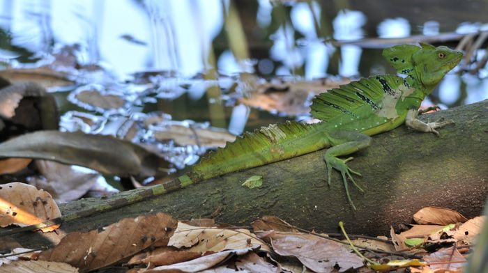 Nous avons moins de chance qu'hier car les animaux tardent à se montrer. Près de l'entrée du parc, nous apercevons un basilic (ci-dessous). Ce saurien vit principalement en Amérique centrale et en Amérique du sud. Il s'accommode parfaitement de la forêt tropicale humide où il se perche en hauteur sur les buissons et même sur la cime des arbres (des arbres situées près des cours d'eau ou d'étangs, car ils se laisse tomber de l'arbre en cas de danger). Excellent nageur, il n'a aucune difficulté à rejoindre le rivage. Ils peuvent même courir sur l'eau. L'animal pèse 90 grammes en moyenne et sa croissance est perpétuelle bien qu'elle se ralentisse fortement à l'âge adulte. Pour les mâles, la taille moyenne est de 70 cm, et un peu moins pour les femelles.