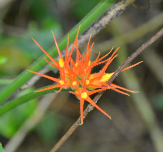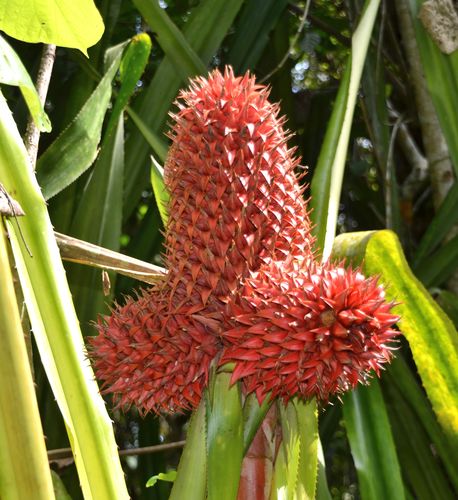 Le parc de Cahuita est aussi riche d'un nombre impressionnant d'espèces végétales comme cet arbre appelé ici jinote qui sert à guérir les dérangements intestinaux. Justo nous montre également un autre plante dont les feuilles, une fois frottées ensemble, dégage une substance qui éloigne les...moustiques. Les chiens d'ici l'utilisent. Je tombe un peu par hasard sur une bromelia pinguin, une fleur assez curieuse mais de grande taille (ci-dessous). Appartenant à la famille des broméliacées, cette plante venue du Mexique a depuis conquis toute l'Amérique tropicale. Elle offre des fleurs de couleur plus ou moins rose, donne un fruit comestible et peut servir de fleur ornementale. Une autre fleur, pepino de montes, occupe aussi le parc (deuxième photo).