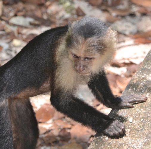 Nous traversons bientôt la rivière Suarez, et ses eaux de couleur marron, teintées des feuilles et des sédiments tombés au sol. Au loin, nous observons des plongeurs. Le parc offre en effet un sentier sous-marin, et d'autres lieux de plongée. On peut aussi pratiquer sur place, outre la baignade, la pêche, le surf, la course à pied et...le bronzage. Mais attention ! N'oubliez pas de quitter la plage une heure avant la fermeture du parc. Les quatre gardes présents sur la zone pourraient être amenés à vous le rappeler. Je suis pour ma part un peu déçu car nous ne voyons que très peu d'animaux. Nous n'entendons pas non plus de chants d'oiseaux, et nous ne verrons d'ailleurs que ce fameux pic vert. Je commence à me lasser de marcher pour rien lorsque nous atteignons Punta Cahuita. Et là, apparaît un singe capucin (ci-dessous), qui se déplace nonchalamment tout en jetant un œil malin sur ce qu'il pourrait emporter avec lui : un drap de bain, un sac de plage... Attention à vos effets personnels ! Notre singe tentera même d'embarquer clandestinement sur ce bateau qui nous ramènera sans peine à notre point de départ.