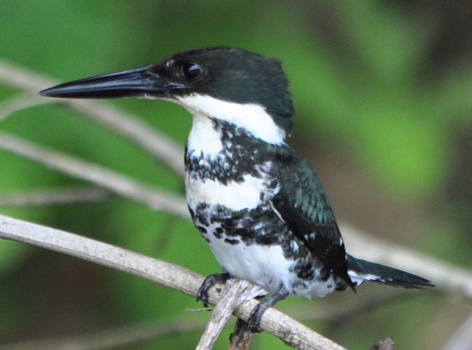 Notre petit groupe poursuit son aventure sur le fleuve San Carlos : nous rencontrons de nombreux oiseaux dont le marin pêcheur vert (ci-dessous). Cette espèce d'oiseau vit principalement depuis le Texas jusqu'en Argentine. Sur la rive, nous apercevons également l'Aningha d'Amérique, oiseau aquatique qui vit dans les parties les plus chaudes du continent américain, dont le Costa Rica. Surnommé « l'oiseau diable » par les Tupi du Brésil, cet animal peut aussi recevoir le nom d'oiseau-serpent, probablement à cause de la longueur de son cou. Ressemblant à un cormoran avec ce cou de 85 cm en moyenne, son envergure de 117 cm et un poids de 1350 grammes, l'Anhinga d'Amérique se veut imposant. Il se nourrit de poisson et nage en ne laissant souvent que le cou et le tête hors de l'eau. Contrairement au canard, il ne peut pas imperméabiliser ses plumes et celles-ci sont vite saturées d'eau, rendant l'oiseau pratiquement incapable de nager. Par contre, cela lui facilite la tâche pour plonger et attraper ses proies sous l'eau, comme les poissons ou les amphibiens. Une fois le ventre plein, il séchera ses plumes sur la rive en se tenant perché pendant de longs moments avec ses ailes déployées, tout comme le ferait un cormoran.