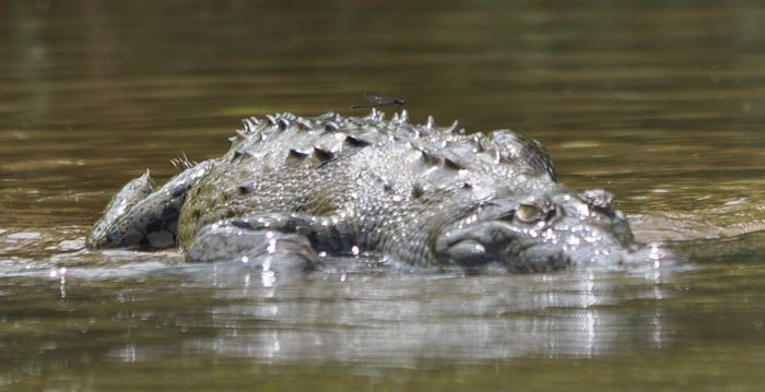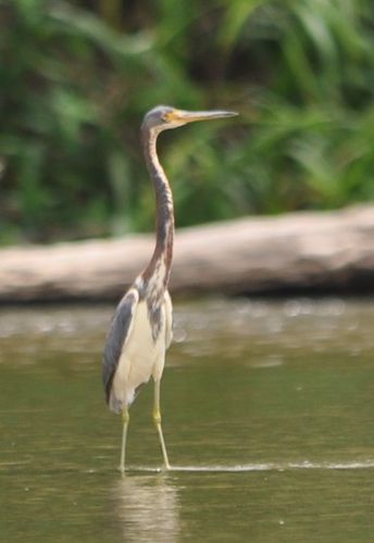 Un échassier, l'aigrette tricolore (en photo ci-dessous), fréquente aussi le fleuve San Carlos. Tout comme ses autres congénères, il peut devenir une proie pour le crocodile qui lézarde pour l'instant sur les rives, plongeant de temps à autre, histoire de prendre le frais (deuxième photo). Vivant dans les régions chaudes, ils fréquentent les eaux douces et vivent immergés dans des cours d'eau stagnantes, passant leurs journées à guetter leurs proies. Très agiles dans l'eau, ils sont plus maladroits sur la terre ferme. Aussi ne vaut-il mieux pas laisser trainer sa main dans l'eau du fleuve lors d'une promenade en bateau.