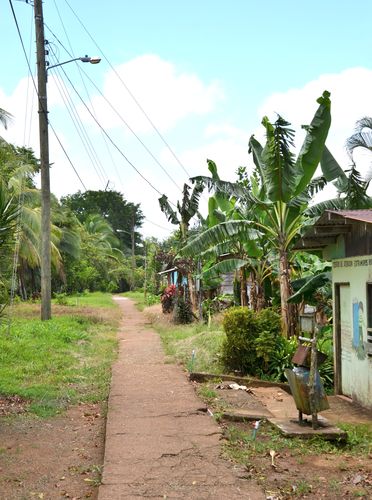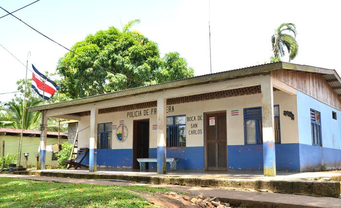 Le but de notre croisière, outre la découverte de la faune et de la flore, est d'atteindre le dernier petit village costaricien dans cette zone avant le Nicaragua. Boca de San Carlos ne possède qu'un peu plus de 200 habitants et on n'y trouve aucune voiture. De toute façon, la rue principale (ci-dessous) ne serait pas assez large pour accueillir des véhicules et puis, on vit si bien sans...Nous sommes chaleureusement accueillis par les deux policiers qui sont affectés dans ce village pour occuper le poste de police local. 90% des habitants de Boca de San Carlos sont de nationalité nicaraguayenne et sont répartis sur les deux rives du fleuve (tout comme le village). Pablo nous explique que certains sont entrés clandestinement au Costa Rica mais sont tolérés car ils viennent souvent effectuer des travaux ingrats. Le coin est tranquille puisqu'on compte un policier pour...100 habitants (cela ferait rêver bien des Français!) et que la nature aide à vivre harmonieusement. Lors de notre visite, nous rencontrerons une vieille dame, une amie de Pablo, âgée de 75 ans et a déjà passé cinquante années de son existence à Boca de San Carlos. Elle a encore plein de projets dans la tête dont celui d'ouvrir un restaurant le long d'une route que l'état costaricien projette de construire dans cet îlot perdu du bout du monde (sa maison longerait cette nouvelle route). Quelle énergie!