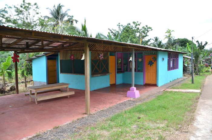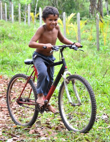 Je rencontre un petit garçon qui monte une bicyclette manifestement trop grande pour lui (ci-dessous) car aujourd'hui, c'est samedi et il n'y a pas école dans le village. L'endroit est bien équipé : une maternelle accueille seize petits, l'école primaire, 76 enfants, et le collège, 35 élèves. Des cours de différents niveaux sont organisés, par demi-journées, permettant même aux plus faibles d'acquérir les connaissances nécessaires à la vie. Une grosse parabole permet aussi d'être relié au monde par internet. J'ai d'ailleurs distribué sur place quelques cartes de mon site internet. 55% des habitants du village sont ainsi étudiants et c'est toute une expédition lorsqu'ils doivent se rendre en ville pour passer des examens. Le maire (ici, on parle plutôt de chef) est le patron du seul café existant dans le village. Le sourire éternel aux lèvres, il nous accueille sans un mot ainsi que d'autres convives du cru. Les enfants sont sagement installés dans deux fauteuils à bascule, et regardent un programme pour enfants à la télévision. Le jardin de ce café donne sur le fleuve San Carlos. La rive d'en face est déjà le Nicaragua. Nous n'y rentrerons pas cette fois car le temps presse et nous devons bientôt repartir. Entre deux grains, je profite de la gentillesse d'un des policiers qui m'offre une pipa fria (il s'agit d'une noix de coco que le policier est allé me décrocher d'un arbre et dont je bois maintenant le contenu). Un policier me dit que les plantes de la montagne sont pour la plupart curatives. Il n'empêche que Boca de San Carlos possède sa propre clinique (ci-dessous). Les habitants doivent tout de même s'acquitter de 24 dollars par mois pour pouvoir bénéficier d'une assurance maladie, alors que la majorité de la population ne travaille pas ou ne dispose que de revenus sociaux. Et lorsqu'on meurt ici, on va désormais se faire enterrer à Pital, la ville la plus proche. C'est un autre monde.
