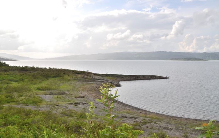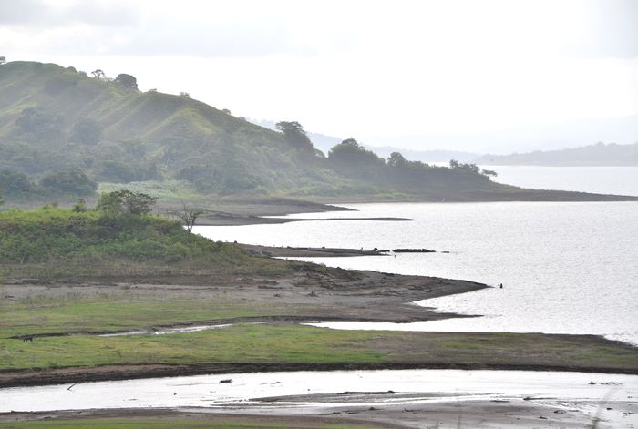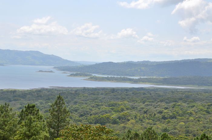 Nous reprenons notre véhicule pour poursuivre la piste sur laquelle nous nous étions engagés, à la recherche du lac Arenal : ce lac artificiel situé (ci-dessous) au pied du fameux volcan est né de la construction d'un barrage en 1974, afin de répondre à une demande grandissante en eau et en électricité de la région. Il fut construit quelques années seulement après la première éruption du volcan et est conçu pour résister à des secousses sismiques (maximum de 9,4 sur l'échelle de Richter) occasionnées par lui. Situé entre deux montagnes, il mesure environ 300 mètres de long et est relié à deux autres infrastructures par deux conduites souterraines. Il comporte enfin un accès à la machinerie et une valve de trop-plein. Ce barrage fit ainsi de cette étendue d'eau le plus grand lac du Costa Rica. Et couvre actuellement 20% des besoins en électricité du pays. Il y a beaucoup de vent à cet endroit, ce qui en fait un paradis pour les véliplanchistes, mais aussi un lieu parfait pour l'installation d'éoliennes. Le tourisme profite aussi de ce lac grâce aux croisières organisées pour les touristes. Les anciens villages d'Arenal et de Tronadora furent submergés par le lac en 1974. Quant à la faune et la flore, elles se sont fortement développées. Les pêcheurs trouveront le machaca et le Bass, les deux espèces de poissons les plus importantes du lac, tandis que les ornithologues, eux, auront toutes les chances d'apercevoir colibris, pic-verts, hérons, martin-pêcheurs, toucans, aricari et de nombreuses autres espèces d'oiseaux.