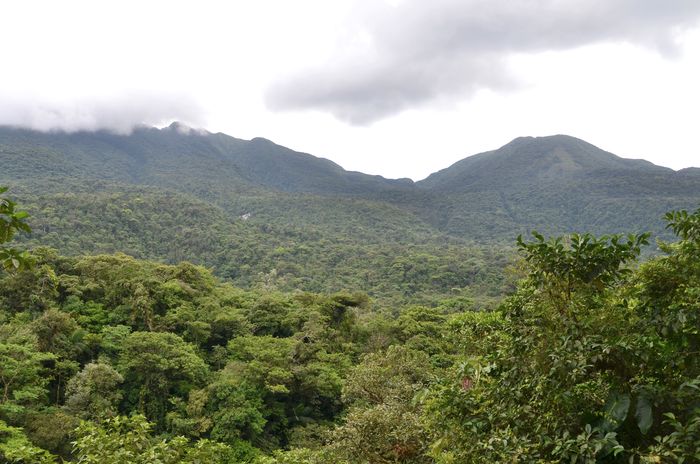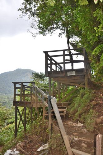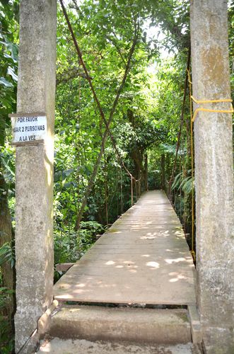 L'endroit est assez fréquenté car nous croiserons plusieurs petits groupes de touristes. Le guide du parc nous a conseillé de pousser jusqu'au pont suspendu (photo ci-dessous). Ce pont, qui n'accepte que deux personnes à la fois, conduit dans une autre partie du parc. Nous arrêtons ici notre marche pour rebrousser chemin et nous rendre au mirador (deuxième photo). La forêt que nous traversons est humide, et nous permet de croiser parfois des insectes (ci-dessous). Les chants d'oiseaux sont rares et seuls le bruit des cigales vient interrompre le silence. Ce parc ne ressemble à rien de ce que nous avons déjà visité auparavant. Cette région volcanique, bien que méconnue, offre des sources thermales, des chutes d'eau et, nous l'avons vu, des lagons aux couleurs surprenantes. Nous n'avons croisé aucun animal sauvage bien que les brochures nous parlent de tapirs et de pumas.