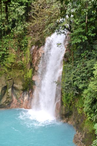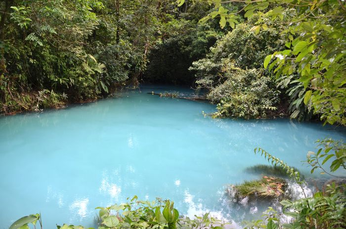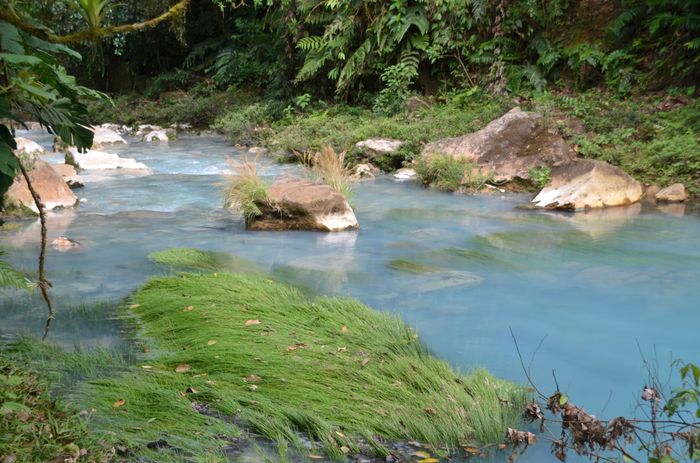 Le volcan Tenorio possède quatre sommets volcaniques et deux cratères (il arrive qu'on surnomme l'un de ces cratères le volcan de Montezuma) et il culmine à 1913 mètres. On trouve en son sommet une forêt tropicale primaire avec tapirs, agoutis, singes et pumas. Face au volcan Tenorio, on aperçoit le volcan Miravalles. La curiosité du lieu est sans aucun doute la rivière Céleste (avec ses eaux d'un bleu inattendu, ci-dessous en photo) dont la couleur bleu lagon de ses eaux est due à l'émanation de soufre depuis le volcan. France et moi entamons bientôt une balade de deux heures qui nous conduira à cette rivière, où nous apercevrons la lagune bleue (deuxième photo), puis quelques dizaines de mètres plus loin, les eaux bouillonnantes dans cette même rivière (troisième photo). Une station géothermique a d'ailleurs été installée sur place. Tout comme de nombreux complexes touristiques de thermalisme. Quant à la fameuse rivière Céleste, une légende prétend qu'après avoir peint en bleu le ciel et la mer, Dieu y aurait rincé ses pinceaux.