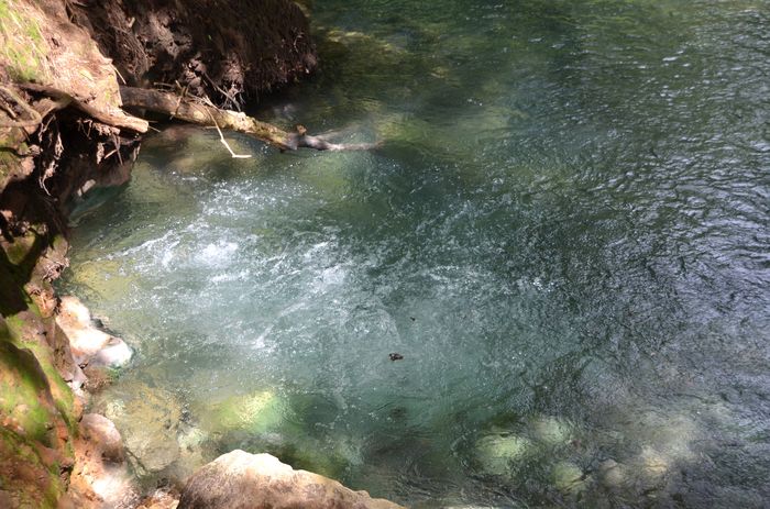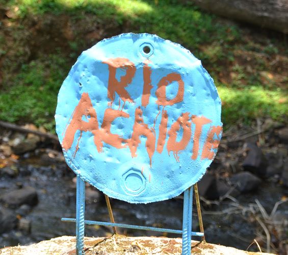 Roulant à une vitesse extrêmement réduite compte tenu de l'état de la piste, nous arrivons 45 minutes plus tard à destination, après avoir traversé la rivière Achiote (ci-dessous), cours d'eau qui, malgré son nom est très propre et laisse couler une eau limpide. L'agence de voyages nous avait prévenu : le lodge Carolina est éloigné de tout, et ne dispose pas d'internet. Quelle est ma surprise en découvrant que le propriétaire a fait installer internet depuis seulement deux mois! Certes, la connexion est lente et parfois instable, mais me sauvera la mise pour ces deux jours que nous passerons ici. Notre chambre est certes rustique mais assez propre, et dans le style typique local, avec moustiquaires aux fenêtres, et une porte...sans serrure (chose impensable chez nous). Plusieurs femmes et quelques hommes s'affairent dans ce lodge. On nous montre les différentes parties de la propriété, la salle à manger située à côté d'une cuisine où le fourneau fonctionne au feu de bois, la rivière en contrebas (avec petite piscine aménagée à proximité) et un jacuzzi alimenté en eau chaude par un système aussi unique qu'ingénieux: un serpentin enroulé autour d'une cuve qui accueille un feu de bois dégageant la chaleur nécessaire pour réchauffer l'eau du tuyau. Il fallait y penser. Autour de nous, rien d'autre que la nature avec ses grands arbres et le bruit des cigales. Des petits lézards traversent parfois les allées de la propriété. Le silence n'est troublé que par le bruit de la rivière qui coule à proximité. Une fois la nuit tombée, Juan, le gardien des lieux allume des dizaines de bougies en guise d'éclairage. Ce qui donne une atmosphère très particulière à ce lieu.