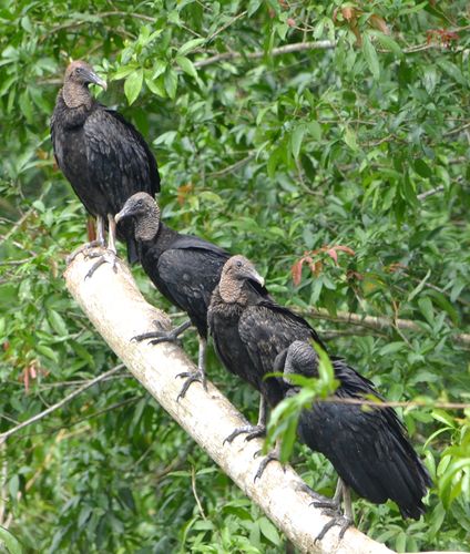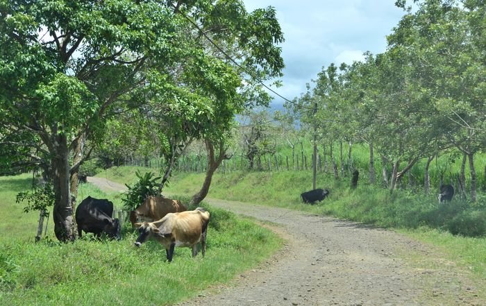 Nous quittons notre refuge de La Fortuna pour partir en direction du volcan Tenorio. Une belle journée s'annonce, une fois de plus. Jusqu'ici, nous avons décidément eu beaucoup de chance. L'itinéraire est le suivant : de La Fortuna, il nous faut rejoindre la route 4 qui nous conduira jusqu'à Upala, pour une première partie du voyage. Puis redescendre vers le parc national Volcan Tenorio, où nous trouverons notre hébergement Carolina Lodge, loin de tout mais fort dépaysant. La route est belle , bien qu'un peu tortueuse par endroits. Nous franchissons un petit pont et observons des charognards (en photo ci-dessous) qui ne s'effarouchent pas le moins du monde quand je m'arrête pour les photographier. Nous trouverons facilement, et très tôt des panneaux indiquant la direction d'Upula. Par contre, je n'avais pas prévu de découvrir, à mi-chemin, un chemin de traverse : France étant au volant, je me charge du repérage et j'aperçois soudain, dans un village un panneau indiquant la mention « Carolina Lodge, 10 km ». C'est inespéré, car cette route va nous faire gagner un temps précieux. France s'arrête à un petit commerce pour boire son café quotidien tandis que je me renseigne sur la fiabilité de ce parcours inattendu auprès des habitants. On nous confirme que ce chemin est le bon, mais qu'il s'agit d'une piste parfois accidentée. En effet, nous traverserons des passages caillouteux particulièrement éprouvants pour les pneus de notre 4X4. J'ai mal pour eux. Nous ne rencontrons que des vaches en train de brouter l'herbe, en liberté, sur les bas-côtés. Que se passerait-il si on tombait en panne dans cet endroit ?