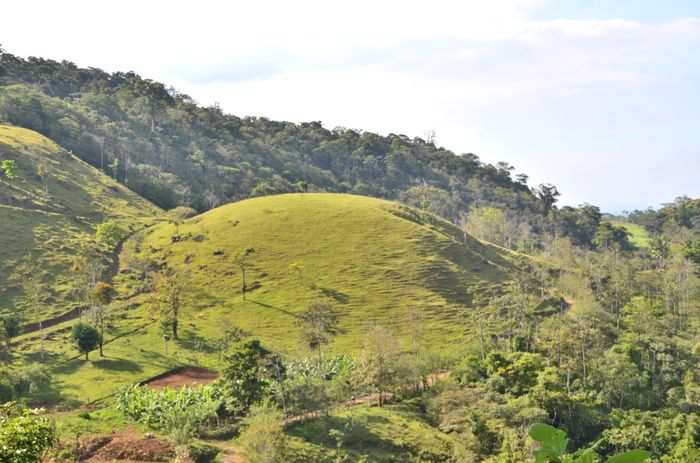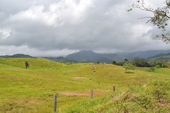 Après être redescendu de notre mirador, nous rebroussons chemin en direction de la cascade (ci-dessous). Celle-ci offre un spectacle extraordinaire au milieu d'un écrin de verdure. Je ne regrette pas de m'être déplacé car cela vaut vraiment la peine. Le parc national Volcan Tenorio est par contre moins bien entretenu que les précédents que nous avons explorés. Si le début du sentier (qui part du centre d'accueil du parc) est parfaitement bétonné (donc praticable), le reste présentera un chemin tantôt rocailleux, tantôt encombré de racines, voire de boue (deuxième photo). C'est dommage ! Il semblerait que le parc ait entamé des travaux de réhabilitation. Attendons de voir... Dans l'immédiat, un droit d'entrée de 10 dollars vous est réclamé pour pouvoir y accéder. Le gardien du parc vous remet un plan basique (quelques coups de crayon sur une demi-feuille de papier) qui vous aidera à vous orienter. Aucune autre brochure d'information n'est disponible sur place. En revanche, nous serons accostés par un homme qui voulait nous servir de guide sur le début du parcours. Nous lui avons fait comprendre que nous nous en sortirions seuls. Lors de notre trajet retour, il est déjà trois heures trente de l'après-midi et la lumière est plus belle. Le soleil commencera à décliner dès 16h00, jusqu'à se coucher deux heures plus tard. Certains paysages me font penser à des alpages suisses...les marmottes en moins.