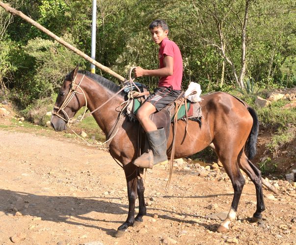 Cette fois, nous sommes en pension complète au Carolina Lodge et le repas de midi à peine avalé, nous repartons pour le parc national Volcan Tenerio. Ce parc a une surface de 129 km2 et ouvrit ses portes en 1976. La vedette de ce parc est le volcan Tenorio qui y fut incorporé en 1995 et n'est situé qu'à une quarantaine de kilomètres de La Fortuna que nous avons quitté ce matin même. Le parc se trouve à 8 kilomètres de notre lieu d'accueil et est accessible par la piste. Sur la route, les paysages traversés sont magnifiques (ci-dessous) et nous rencontrons d'ailleurs un petit garçon sur son cheval (deuxième photo) qui nous fait l'amitié de poser pour la photo. C'est le fils d'Alejandro, qui travaille au lodge La Carolina. Sur notre chemin, nous traversons le hameau de San Miguel, avec sa petite école et son église. C'est de là que viennent certains employés du lodge. Ici, il n 'y a pas d'insécurité, personne ne dérobe quoique ce soit et tout le monde se connait. On est content d'accueillir les touristes car cela permet de faire tourner l'économie locale, habituellement dominée par l'agriculture. Vu la difficulté d'accès, je me demande s'il vient beaucoup de visiteurs au parc. Je serai surpris de voir une dizaine de véhicules garés sur le parking. La riche biodiversité de ce site s'explique par la grande variété des facteurs climatiques due à l'influence des deux océans Atlantique et Pacifique, mais aussi à l'important dénivelé de 700 à 1960 mètres, et enfin aux nombreuses rivières qui le traversent. On peut y observer la forêt pluvieuse tropicale, la forêt tropicale très humide et la forêt de transition pré-montagneuse. Ce climat particulier offre une saison sèche très courte, s'étalant de janvier à mai. Les températures varient toute l'année de 15 à 24°C. On y croise des toucans, des tapirs et des margays (petit félins de la forêt tropicale)