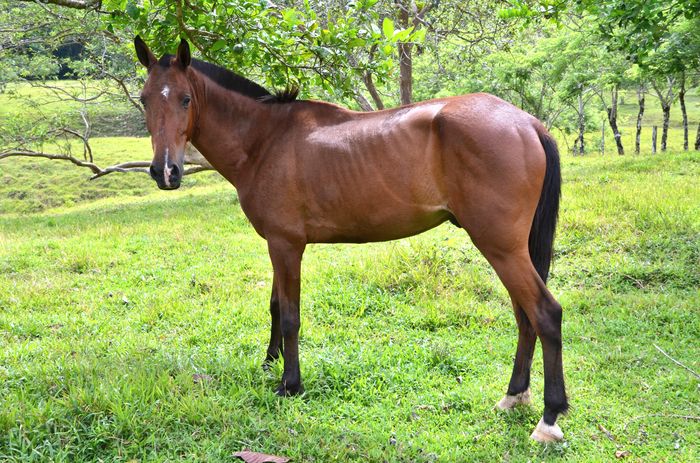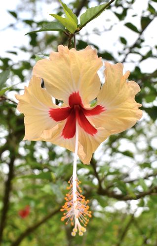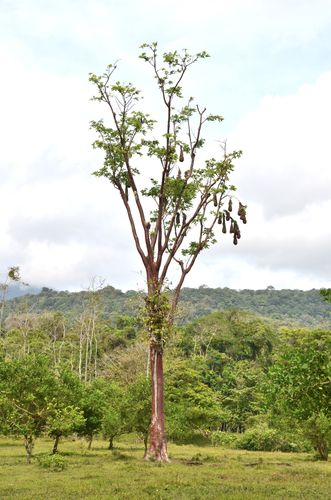 Il nous faut parfois ouvrir un enclos pour pouvoir poursuivre notre chemin mais nous prenons bien soin de le refermer après notre passage pour que les animaux ne s'enfuient pas. Je m'arrête, admiratif, devant un énorme taureau qui profite, comme nous, de ce début de matinée. Sur le sentier, nous remarquons un arbre contenant plusieurs nids de cassiques de Montezuma (ci-dessous). Plus loin, c'est un nid de guêpes qui a trouvé refuge dans un feuillu. Nous terminons notre périple en longeant la piste jusqu'à regagner le lodge par l'entrée principale. Je ne résiste pas alors à photographier ces magnifiques hibiscus (deuxième photo).