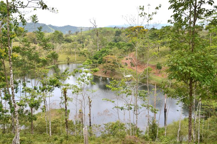 Après une boisson rafraichissante, nous reprenons le 4X4 pour nous rendre à cinq minutes de là, dans une ferme (ici, une finca) qui fait partie de la même propriété. Un grand étang (ci-dessous) constitue le point d'attraction majeur. Nous y sommes conduits par le métayer de l'endroit qui occupe une petite maison de bois sans électricité. On nous explique qu'ici, les fermes sont vastes. La finca que nous visitons ne contient par exemple qu'une vache et trois volailles mais cultive intensivement les bananes et le yucca, une racine comestible dont on se sert à La Carolina Lodge pour préparer notamment des chips. Le yucca que me présente le métayer pèse bien six kilos.