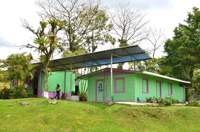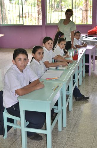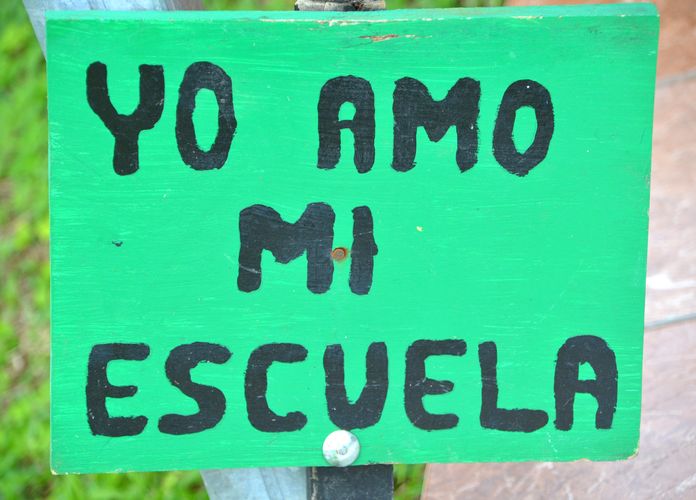 J'ai remarqué hier une petite école située sur le bord de la route. Je demande à Edwin, notre cuisinière s'il nous serait possible de la visiter. Un coup de téléphone à l'institutrice et nous voici partis en direction d'un petit village d'une trentaine de maisons éparpillées aux alentours, San Miguel. L'école n'accueille actuellement que six élèves et ne possède qu'une classe primaire. Les enfants portent tous l'uniforme (c'est la règle à l'école primaire) dans un souci d'effacer les différences sociales entre les élèves. Sarah, l'institutrice nous explique que l'école ouvrit ses portes pour la première fois en 1966. Celle-ci n'était alors qu'une petit bâtiment en bois. Elle fut reconstruite en plus grand quatre ans plus tard par la communauté du village. Le ministère de l'Education possède l'école mais la communauté villageoise participe activement au maintien de celle-ci (travaux à effectuer). Ici, les habitants se prennent en charge plus que partout ailleurs et attendent peu de choses du gouvernement. A l'extérieur, je remarque plusieurs panneaux peints à la main sur lesquels sont inscrites des phrases tellement vraies comme par exemple « J'aime mon école » (en photo ci-dessous), ou bien « Nous ne détruisons pas ce que Dieu nous a donné avec tant d'amour », ou enfin « Nous prenons soin de la planète ». Je sens une certaine timidité chez notre institutrice ainsi que chez certains élèves. Il est vrai qu'il n'est pas habituel d'accueillir en salle de classes des étrangers.Nous nous présentons à l'assistance et j'explique en quelques mots ce que nous faisons ici, d'où nous venons, et en quoi consiste mon métier. On m'écoute avec attention mais on ne me posera pas de questions. Sarah m'apprend que les élèves ont école tous les matins, du lundi au vendredi, de 7h00 à 13h00 (avec une pause de 40 minutes pour déjeuner à partir de 10h40). Les enfants présents ont de 9 à 11 ans et l'on relève la plus stricte parité (un pur hasard) dans le groupe : trois filles et trois garçons. Les petits Costariciens n'ont que 15 jours de vacances par an plus un autre mois (à partir de décembre) et étudient le calcul, l'écriture, la lecture ainsi que la nature. Ils ne sont que six dans cette classe mais ont pour habitude travailler par petits groupes.