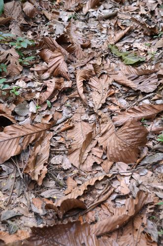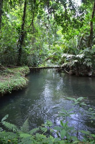 J'ai merveilleusement dormi cette nuit, au son de la rivière coulant en contrebas. Les bruits de la jungle commencent à se faire entendre vers les cinq heures du matin et une nouvelle journée débute. Notre petit déjeuner nous sera servi à notre convenance, mais l'équipe du lodge s'active déjà à ses tâches quotidiennes. Ma préoccupation majeure est de décider ce que nous allons faire aujourd'hui, car nous sommes dans un endroit reculé et il n'y a pas grand chose à faire autour de notre point d'hébergement. Nous commencerons donc par une promenade dans l'immense propriété. Alejandro nous conduit au début du sentier que nous devrons suivre ensuite grâce à des flèches jaunes savamment disposées sur les troncs d'arbres. Une heure trente sera nécessaire pour parcourir ce sentier tout en profitant d'un superbe soleil. Nous traverserons tour à tour des paysages très différents : nous traversons d'abord une vaste prairie vallonée qui nous fait penser à la Suisse, puis pénétrons dans la forêt tropicale humide. Le sentier est alors recouvert d'énormes feuilles mortes (ci-dessous) qui subjugue France. Nous longeons la rivière (deuxième photo), franchissons plusieurs petits ponts de bois, observons le travail des fourmis qui transportent des végétaux, puis des grenouilles minuscules, avant de déboucher sur une autre prairie dans laquelle paissent des vaches mélangés à des chevaux (troisième photo).