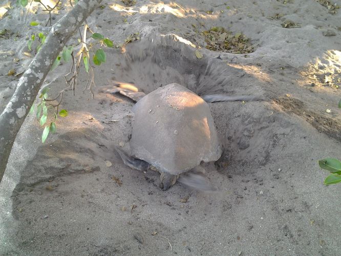 Gerardo, un des guides, a repéré une tortue venue pondre dans le sable en haut de la plage. Des traces de son passage sont encore visibles sur le sable et nous les suivons pour nous diriger vers elle. La pauvre bête, déjà épuisée, tente de creuser le trou dans lequel elle pondra ses œufs, mais, en vain : des racines d'arbres voisins contrarient son projet et elle décide de trouver un endroit plus accueillant. Nous la suivons vers un autre lieu où elle parvient à creuser un trou suffisamment grand. Notre guide utilise une lampe à lumière rouge, supposée de pas déranger l'animal. Je tenterai de prendre quelques photos, mais sans résultat. Il semblerait que, devant les contraintes imposées, les autres membres de notre sortie nocturne n'aient pas non plus réussi à prendre un cliché. Je m'en émeus auprès du guide mais celui-ci me répond que nous étions prévenus. Têtu, je persiste et maintiens qu'il n'y a aucun intérêt à protéger les tortues si on n'est pas capable de partager son expérience avec ses proches, ses amis, ou tout simplement avec d'autres internautes (ce qui est mon objectif). Je rencontre sur place deux jeunes biologistes qui travaillent sur l'étude des tortues et leur fait part de mes regrets. Je leur dis que je comprends la gêne que la lumière trop forte peut occasionner à l'animal mais regrette qu'on lèse les clients que nous sommes en interdisant une prise de photos convenable. Ils sont surpris de la somme demandée par l'agence. C'est là que je comprends que, comme les autres, je me suis fais flouer. La seule photo que je parviendrai à prendre est celle de la ponte des œufs (ci-dessous) car le guide éclairera l'arrière train de l'animal avec une lumière suffisante. Piètre résultat pour une sortie qui durera au total trois heures et durant laquelle on ne verra....qu'une seule tortue.