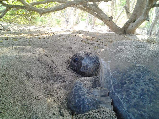 Cette tortue verte, appelée aussi tortue franche, parlons-en. Il s'agit d'une tortue marine qui fréquente les eaux tropicales de tous les océans, mais est plus ou moins visible selon les régions. Elle affectionne les eaux peu profondes et riches en zostères (plantes aquatiques) sans pour autant ne se nourrir que de cela. Les adultes parcourent de très longues distances entre les herbiers et les zones de nidification. Contrairement aux autres tortues marines, on a déjà observé que la tortue verte prenait parfois des bains de soleil sur les plages, tout comme d'autres reptiles.