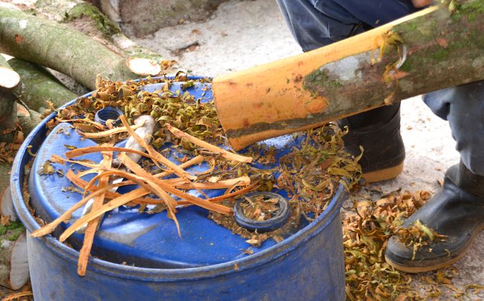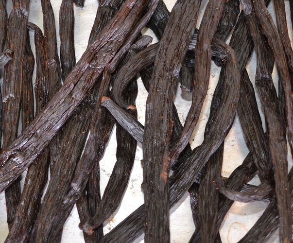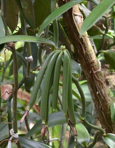 Cette orchidée (la seule qui soit cultivée pour des raisons autres qu'ornementales) requiert beaucoup de soins. Notre guide nous explique comment croit cette plante qui a besoin d'un climat chaud et humide, d'un support d'accrochage et d'un certain ombrage. Trois techniques de plantation existent et la fécondation doit être assurée manuellement , fleur par fleur, faute d'insecte disponible pour faire le travail. La vanille n'est malheureusement pas en fleurs actuellement (la floraison a lieu de mars à début mai) mais nous apercevrons tout de même des gousses fraiches (première photos ci-dessous) et séchées (deuxième photo ci-dessous). Lors de cette visite, d'autres épices sont abordées (poivre, cardamome, clous de girofle, curcuma et cannelle). Un ouvrier nous montre comment il obtient l'écorce de cannelle (troisième photo) et nous goûtons à cette plante dont on incorpore des extraits dans les pâtisseries.