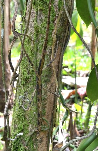 Daniel, le fils de notre guide, nous montre un drôle d'insecte sur un arbre (en photo ci-dessous). Je ne le distingue pas dans un premier temps, mais, en m'approchant un peu, je découvre un corps ressemblant étrangement à des brindilles d'arbre et plusieurs pattes. La nature offre décidément des techniques de camouflage extraordinaires. Une visite dans le parc nous permettra d'enrichir nos connaissances sur un grand nombre d'épices cultivées ici, au Costa Rica. L'histoire de la seule vanille est associée à celle du chocolat. Les Aztèques, et encore avant, les Mayas, agrémentaient de vanille une boisson épaisse à base de cacao, qui était alors destinée aux nobles et aux guerriers, xocoati. Ils ne cultivaient pourtant ni le cacao,, ni la vanille, en raison du climat inadapté. Ces denrées de luxe provenaient des contrées voisines. Ainsi appelaient-ils la vanille, « fleur noire ».