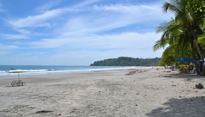A une encablure de là, un autre bar-restaurant, le Wagon, est hébergé à l'intérieur d'un ancien wagon costaricien. A découvrir également. Notre route nous conduit bientôt au parc national Manuel Antonio. A notre approche, des hommes nous font signe de nous arrêter pour nous garer. Ayant remarqué qu'il ne s'agissait pas de la police, nous poursuivons notre chemin sous les coups de sifflets. Un kilomètre plus loin, d'autres « rabatteurs » se livrent à la même pratique. Nous découvrons peu à peu un système illégal de parking. Après information, il est impossible de se garer gratuitement dans cette zone sous peine de retrouver sa voiture rayée. Les rabatteurs illégaux demandent 4 US$ pour se garer. Etant venus en éclaireurs, nous filons directement au parc afin de prendre des informations : à ma grande surprise, le bureau du parc m'informe que les billets d'entrée sont en vente à la banque Western Union et que des guides indépendants du parc sont joignables à proximité et négocient leurs propres tarifs. Etrange pratique ! Dépités, France et moi décidons de laisser tomber la visite de ce parc, qui a pourtant été classé en 2011 comme l'un des douze parcs les plus beaux du monde. En face du parc se trouve une belle et grande plage (ci-dessous) où se retrouvent les adeptes du bronzage et de la baignade.