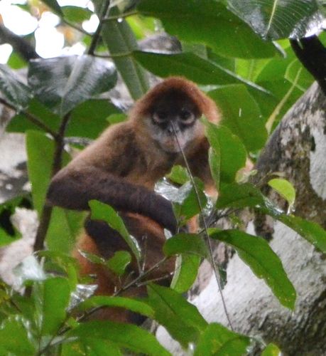 Comme à l'accoutumée, je me réveille, et remarque qu'il pleut des cordes. C'est la première journée de mauvais temps que nous connaissons depuis notre arrivée il y a trois semaines. Cela ne contrariera pas cependant notre projet de visiter la Posada El Silencio, un centre qui recueille les animaux blessés. Ce centre est situé à une trentaine de minutes de Quepos, à proximité de la rivière Savegre (que les pluies récentes ont passablement fait gonfler). On y accède par une piste accessible une fois la rivière franchie. Nous nous enfonçons dans la forêt et constatons avec surprise que des gens vivent dans les coins les plus reculés. Le centre en question existe depuis 1998 et accueille les animaux souffrant de blessures ou trouvés en situation de détresse. Ramenés au refuge, ces derniers sont soignés, bichonnés, puis relâchés plus tard avec l'autorisation du gouvernement costaricien. Malheureusement, certains d'entre eux ne pourront plus jamais retourner à la vie sauvage. D'une superficie de 4 à 5 hectares, ce centre se trouve au milieu d'une propriété coopérative, la Coopesilencio, qui possède 1000 hectares de terrain. Le centre compte un employé, Johan Barboza Amador, qui se charge d'entretenir l'endroit, de nourrir et de prendre soin des sept singes araignées (en photo ci-dessous), de deux singes capucins, de quatre perruches, et d'un raton laveur récemment accueilli au centre.