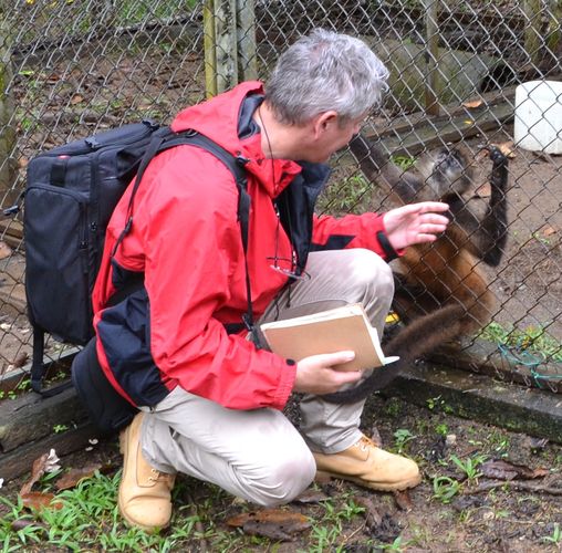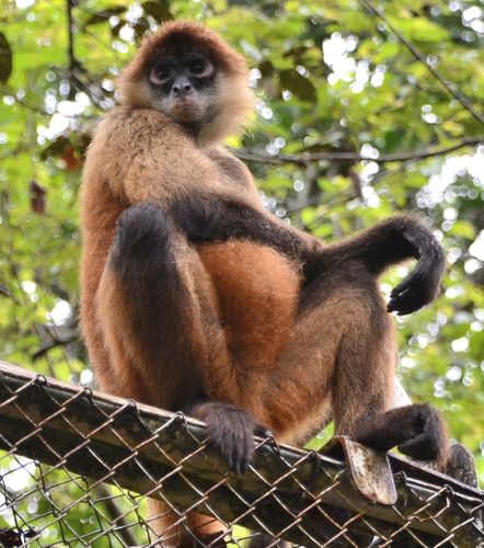 Nous rendons visite aux singes araignée présents dans le centre de sauvetage. Ce terme désigne en réalité plusieurs espèces de singes d'Amérique dont les singes-araignée à ventre blanc, les singes-araignée aux mains noires et les singes-araignée laineux. Le singe-araignée aux mains noirs que nous découvrons vit essentiellement dans les arbres d'Amérique centrale et du nord de l'Amérique du sud. Vivant habituellement en communauté de 20 à 40 individus, ils se séparent parfois en sous-groupes pour rechercher leur nourriture. Leur habitat va des plaines jusqu'à une altitude de 2700 mètres. Ils se nourrissent principalement de fruits (à 80%), mais aussi de noix, de feuilles, de jeunes pousses, de fleurs et, plus rarement d'écorce, de racine, de miel et d'insectes. Après accouplement, la femelle donne naissance à un petit après 225 jours environ de gestation. Les 45 premiers jours, le petit va s'accrocher sous le ventre de sa mère, puis sur le dos de celle-ci 90 jours de plus. Il va ensuite apprendre à s'alimenter durant toute une année. Le poids du singe-araignée est de 7 kilos, et leur queue préhensile peut atteindre 50 centimètres de long. En m'approchant de la cage grillagée dans laquelle se trouvent ces singes-araignée, je peux saisir leur queue qu'ils glissent entre les mailles du grillage (ci-dessous). Puis la main, une main à quatre doigt longs et comme satiné à l'intérieur. De toute évidence, nous sommes cousins car les singes veulent communiquer avec moi et recherchent un contact. Ils me regardent en m'adressant des petits cris. Ils sont aussi extrêmement jaloux si Johan s'approche de moi et le font savoir en poussant de terribles hurlements.