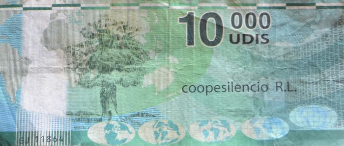 Une autre spécificité de La Posada El Silencio : l'existence d'une monnaie locale. En effet, le centre a créé des billets de 1000, 2000, 5000 et 10000 UDIS (ci-dessous) pour rémunérer par exemple le salarié (en totalité ou en partie) qui le souhaite. En échange, celui-ci participera complètement au projet de monnaie solidaire et bénéficiera d'une remise de 10% sur ses consommations à la cafétéria.