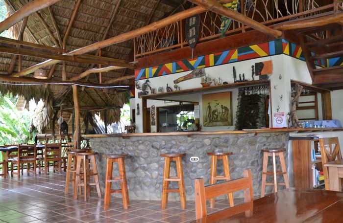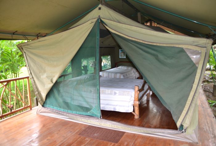 Nous quittons bientôt notre refuge et saluons toute l'équipe du centre. Puis, nous prenons la direction du Rafiki Safari Lodge, un magnifique ensemble hôtelier niché au creux d'une vallée dans un écrin de verdure. Il nous faudra rouler sur une piste escarpée pendant 10 kilomètres avant d'atteindre l'endroit mais le propriétaire des lieux a eu la bonne idée de poser des panneaux le long de celle-ci pour encourager les visiteurs (voir l'album photos en haut de cet article à droite). L'idée de construire un lodge africain en pleine jungle costaricienne est originale et est l'oeuvre de Carlo et Janel, un couple de Sud-africains. La construction nécessita deux années de travail acharné mais le jeu en valait la chandelle. Nous sommes chaleureusement accueillis par Janel et déjeunerons sur place. Une équipe d'une dizaine de personnes veille au bien être des hôtes qui sont hébergés sous des tentes typiquement africaines (ci-dessous en photo). Depuis la terrasse du Lekke Bar, la vue est imprenable sur la montagne environnante et on peut admirer les jardins au milieu desquels se trouve un étang dans lequel on peut se baigner (il y a bien un caïman mais celui-ci s'enfuit à l'arrivée des nageurs!). Des activités sont bien entendu prévues comme le rafting et le kayak sur la rivière Savegre (deuxième photo) mais aussi la visite des cascades et des promenades à cheval. A ma grande surprise, je rencontre la nounou du fils de Carlo et Janel. Celle-ci est japonaise mais ne parle pas la langue. Par contre elle comprendra ce que je lui dis en japonais. La pluie tombe à nouveau sur la région et nous repartons à regret car cette pause au milieu de nulle part aura été extrêmement agréable.