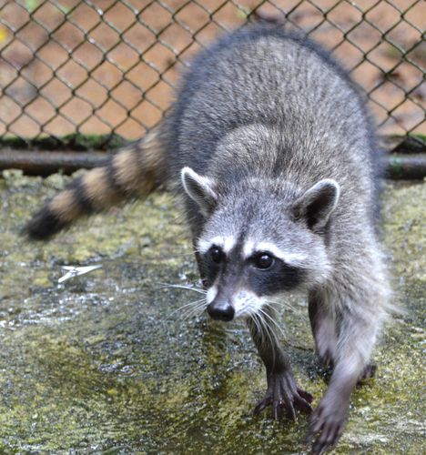 Un raton laveur a , lui aussi, été sauvé du désarroi (en photo ci-dessous). Originaire d'Amérique, cet animal doit son nom à son habitude de tremper ses aliments dans l'eau avant de les consommer. Essentiellement nocturne, il grimpe facilement aux arbres grâce à ses doigts agiles et à ses griffes acérées. Il est facilement reconnaissable à son masque noir bordé de blanc autour des yeux et à sa queue rayée de noir et de blanc. L'animal s'adapte bien aux différents milieux naturels, est opportuniste et aussi facile à apprivoiser.