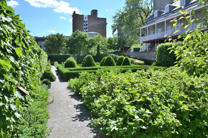 Le Jardin du Gouverneur, du Château Ramezay (ci-dessous), évoque quant à lui un jardin de l'époque de la Nouvelle-France, bien que l'espace aménagé côté rue Notre-Dame soit aménagé tel qu'il l'était à l'ouverture du musée au XIX è siècle. Il s'agit dans ce dernier cas d'un jardin de style paysager ou encore d'un jardin à l'anglaise. Le jardin paysager est né en Angleterre au XVIII è siècle en réaction au jardin à la française, très policé. Il représente l'amour des Anglais pour la nature et a pour sources principales la peinture du paysage romain.