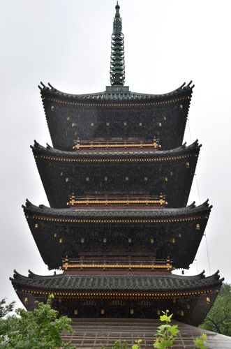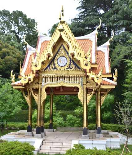 Une pagode à cinq étages (ci-dessous), dont le premier étage est actuellement en réfection, fut construite pour la première fois en 1631, détruite par un incendie, puis reconstruite. Celle-ci fut ensuite offerte, en 1958, par le Temple Kaneiji au zoo. Ce temple était un temple bouddhiste Tendaï qui fut fondé en 1625 par Tenkaï près de l'actuel parc d'Ueno et de la gare d'Uguisudani. Son nom vient de l'ère Kan'ei durant laquelle il fut érigé. Cette ère couvrit la période allant de février 1624 à décembre 1643, et correspond à un changement de cycle du zodiaque chinois. Le principal objet d'adoration était le Yakushiruriko Nyoraï et son nom est inextricablement lié au shogunat Tokugawa. Juste à côté, une maison de cérémonie du thé (deuxième photo ci-dessous) offre aux visiteurs de gouter au précieux breuvage nippon. Cette maison fut érigée au XVII è siècle pour divertir les shoguns, c'est à dire il y a 350 ans. Les shoguns qui s'y arrêtaient se rendaient généralement en pèlerinage au sanctuaire Toshogu. Ce sanctuaire, situé à Nikko, est un haut-lieu du bouddhisme japonais et est peut être le plus décoré du Japon. Ses toits ornés, sa porte monumentale à deux étages, ses fresques à l'encre et autres dragons célèbres sculptés, en font un joyau du patrimoine nippon. Un pavillon thaï se dresse également non loin de l'entrée du parc zoologique (troisième photo). Celui-ci fut offert au Japon par le gouvernement royal thaï, le 26 septembre 2007, pour célébrer le 120è anniversaire des relations diplomatiques entre le Japon et la Thaïlande.