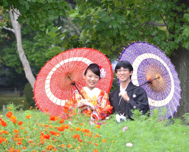 Je pénètre dans le jardin par l'entrée Otomon et débute ma visite par une halte devant des pins tricentenaires (ci-dessous). Ceux-ci furent plantés en hommage à Ienobu, sixième shogun, qui dirigea les grands travaux de réaménagement du lieu. On peut encore aujourd'hui admirer la forme majestueuse des pins qui déploient leurs branches imposantes. A deux pas de là, se trouve l'espace Uchibori, avec son jardin fleuri. De jeunes mariés (deuxième photo) se font photographier dans ce cadre magnifique. Au printemps, un jardin de pivoines offre une des plus somptueuses floraisons aux multiples couleurs. Pruniers du Japon en fleurs, chimonanthes précoces, narcisses, magnolias, cerisiers Yoshino, glycines du Japon, pivoines arbustives, rhododendrons et azalées s'épanouissent de janvier à mai. L'été est la saison des iris, des hortensias, des bignones et des lilas d'été. On peut également observer la beauté du colza, puis celle des cosmos sulphureus. Novembre est le mois où les feuilles du toxicodendron succedaneum rougissent, tout comme celles de l'érable palmé et du ginkgo biloba.