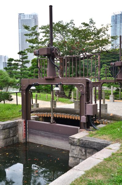 Je poursuis ma balade et traverse le jardin des pruniers pour atteindre quelques minutes plus tard l'embarcadère des navettes fluviales. Ces navettes, qui transportent les passagers sur la rivière Sumida, s'arrêtent au jardin Hama-rikyu, en franchissant une écluse (ci-dessous). Elles vous conduiront ainsi d'Asakusa à Ryogoku, d'Odaiba-Kaihinkoen à Kasai-Rinkaikoen en passant par Sakurabashi. Pour plus de détails, reportez-vous à un précédent reportage consacré à la croisière sur la rivière Sumida. Un peu plus loin, la petite écluse Yokobori (seconde photo) permet d'alimenter en eau de mer l'étang Koshin-do Kamoba (troisième photo). Plus loin, je repère les restes d'une ancienne maison de thé,Umite-Chaya. Celle-ci, autrefois bâtie pour servir de lieu de détente afin d'admirer bateaux et pêcheurs, à l'époque de iénobu Tokugawa, accueillait les gens de cour et les femmes du château d'Edo. Le nom Umite-Chaya provient du fait que l'endroit offrait une vue imprenable sur la mer. La maison brûla lors du séisme du 1er septembre 1923. Un pont, Umite Otsusaï bashi, permet de traverser l'étang pour se rendre sur l'autre rive. En prolongement de cet étang, on trouve l'étang Shiori no ike (quatrième photo) qui signifie la lagune de la marée montante. C'est le plus grand plan d'eau du parc, lagune artificielle dont le niveau varie en fonction de la marée. De nombreux poissons d'eau de mer y vivent comme les mulets ou les anguilles.