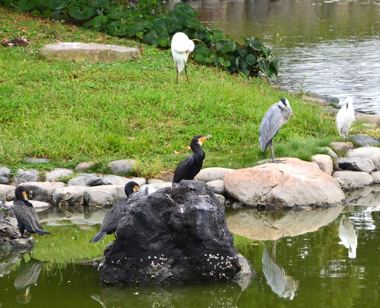 De nombreux oiseaux trouvent aussi refuge dans ce jardin (ci-dessous), dont des sauvagines (gibiers à plumes) qui étaient autrefois chassés par les shoguns, lesquels se dissimulaient derrière de petites collines aménagées (deuxième photo). Deux étangs étaient aménagés pour la chasse aux canards sauvages. Le Koshindo Kamoba date de 1778 et le Shinsenza-Kamoba (troisième photo), de 1791. Ces étangs étaient équipés d'étroits fossés destinés à piéger les canards qu'on attirait en répandant du millet sur le plan d'eau ou en se servant d'autres canards domestiques. Les oiseaux étaient alors capturés à l'aide de filets ou grâce à des faucons. Je croise de nombreux promeneurs en déambulant dans les allées du jardin Hama-rikyu et j'arrive bientôt sur la rive de l'étang Shiori. Des repères servant de camouflage aux chasseurs sont des raretés car il n'en existerait que dans cinq endroits sur la planète.