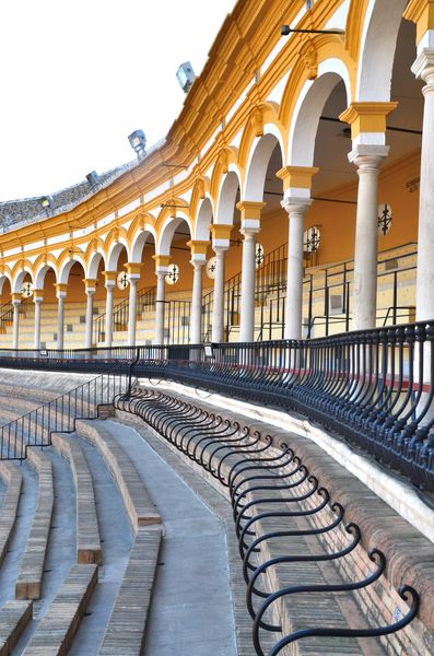 Je commence ma visite de Séville par le quartier de El Arenal, bordé par le Guadalquivir et gardé par la Torre del Oro, Cet endroit abritait autrefois des dépôts de munitions et des chantiers navals. De nos jours, ce sont des arènes d'ne blancheur éblouissante, La Plaza de Toros de la Maestranza, qui dominent désormais. Celles-ci accueillent des corridas depuis plus de deux siècles. C'est là où je vais vous emmener aujourd'hui. Arènes de Séville, Plaza de Toros, ou La Maestranza, tous ces noms identifient le même lieu. Bâties entre les XVIII è et XIX è siècles, ces arènes sont la propriété de l'institution militaire laïque qui leur donne leur nom, la Real Meastranza de Caballeria. C'st l'un des monuments les plus visités de la ville à cause de son architecture unique (ci-dessous) , à tel point qu'elles furent classées le 7 décembre 1983 comme bien d'intérêt culturel d'Espagne. Les arènes représentent en effet un des hauts-lieux de la corrida dans le pays et accueillent d'ailleurs l'une des férias les plus importantes, la Feria de Abril.