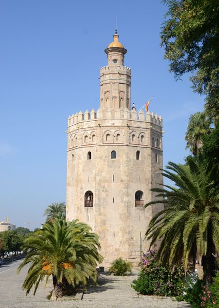 Non loin de là, le long du merveilleux Guadalquivir, se dresse toujours la Tour de l'or (Torre de oro), ci-dessous. Cette tour d'observation militaire fut construite au début du XIII è siècle, durant la domination almohade, pour contrôler l'accès à la ville depuis le fleuve. Elle faisait partie des fortifications érigées autour du centre historique sévillan et de l'Alcazar par les almoravides et les Almohades entre les XI è et XIII è siècles. Le nom de cette tour puiserait ses origines de l'or ramené d'Amérique au XVI è siècle lors de la Course des Indes (période d'exploration et de colonisation initiée après la découverte de l'Amérique par Christophe Colomb en 1492). C'est là que cet or était conservé. Certains prétendent que le nom serait du au rendu de couleur dorée de la tour. Les travaux de restauration effectués en 2005 confirmeront que cet aspect brillant était du, en fait, à un mélange de chaux et de paille pressée. Les XII è et XIII è siècles virent les Almohades améliorer les fortifications construites par leurs prédécesseurs, les Almoravides, entre les XI è et XII è siècles. La construction de la Tour de l'or, en 1221, constitua la dernière étape de l'édification de l'enceinte fortifiée de la ville, à la fin du règne almorade. Cette tour albarrane ne faisait pas partie de l'enceinte principale mais se trouvait à l'extrémité d'un pan de muraille perpendiculaire à l'enceinte principale de la muraille entourant l'Alcazar. Contrairement aux autres tours, qui étaient rectangulaires, la Tour de l'or, elle, plus massive comme les tours palatines a une base dodécagonale. Durant le Moyen-âge, cette même tour servira de prison.