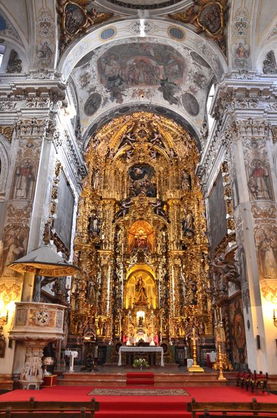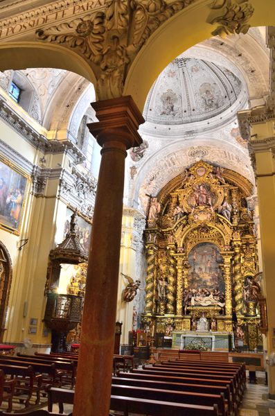 Première halte, l'église de la Madeleine , qui fut achevée en 1709. Elle fut construite dans le style baroque par Leonardo de Figueroa. On doit à cet architecte plusieurs églises et couvents à Séville même, à la fin du XVII è et au début du XVIII è siècle. Né à Séville en 1650, on sait qu'à l'âge de vingt ans, il se trouvait toujours dans cette ville où il exerçait le métier de maitre maçon. Il y passera le restant de sa vie. Sa première œuvre mémorable sera l'hôpital des Vénérables, dont il dirigera la construction entre 1686 et 1696. A partir de 1691, il travaillera à l'édification de l'église et du couvent dominicains de San Pablo la Real, cette fameuse église de la Madeleine que je visite aujourd'hui. Les bâtiments conventuels ont par contre disparu depuis. L'élément le plus remarquable de cet ensemble est cette audacieuse coupole coiffant le transept (deuxième photo). Le caractère très décoratif et polychrome de son œuvre atteint un haut degré de splendeur à l'intérieur comme à l'extérieur. Au dehors, la brique de taille alterne avec les azulejos aux couleurs vives, les stucs et les peintures monumentales. A l'intérieur, on peut admirer plusieurs œuvres religieuses comme cette toile de Francisco de Zurbaran, Saint Dominique à Soria, dans la chapelle sacramentelle, ainsi que des fresques de Lucas Valdès au-dessus du sanctuaire représentant L'allégorie du triomphe de la foi. L'angle sud-ouest abrite la chapelle de la Quinta Augustia, chapelle mudéjare à trois coupoles héritée d'une église antérieure où fut jadis baptisé le peintre espagnol Murillo en 1618. Les anciens fonts baptismaux se trouvent quant à eux dans le baptistère de l'édifice actuel.
