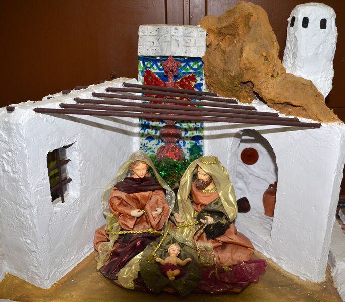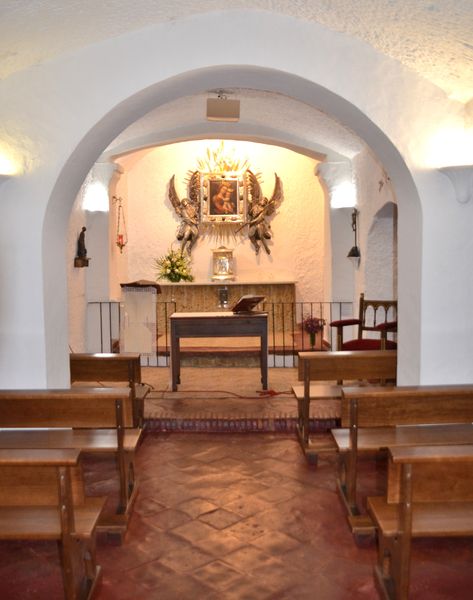 Nous sommes ensuite accueillis par le prêtre de l'église Ermita Nuestra Senora de Gracia, toute proche. Connue autrefois sous le nom d'Ermita Nueva, celle-ci devint une paroisse lors de la Guerre civile espagnole. En fait, l'église est composée d'une salle principale avec, à côté, plusieurs petites grottes aménagées (ci-dessous). Certaines d'entre elles abritent une superbe exposition de crèches (300 au total) venues du monde entier (deuxième photo). Il nous faut bientôt repartir, non sans avoir admiré une dernière fois au loin la forteresse arabe, appelée Alcazaba (troisième photo ci-dessous), qui servait à la fois de palais et de défense durant l'occupation musulmane. Curieusement, cette forteresse ne possède pas d'entrée principale et elle fut construite sur les ruines d'un château romain. Elle date du XIII ème siècle (la muraille de Guadix, elle, fut construite plus tôt). Lors de la Reconquête, l'Alcazaba fut occupée par les autorités militaires chrétiennes. En son centre, on peut distinguer une grosse tour, prénommée Tour de l'Hommage. Actuellement, la forteresse est en cours de restauration.